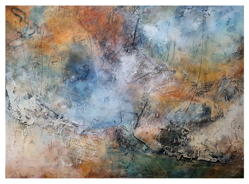 'Beneath the Sun' was part of my recent joint exhibition 'Extended'. I have been experimenting with printmaking and cold wax for some time now, this work is a culmination of many printmaking processes. I love the rich surface of cold wax medium juxtaposed with the smooth original rice paper lino print I embeded into the wax medium. My handmade rusted papers and encaustic monoprint has been coll