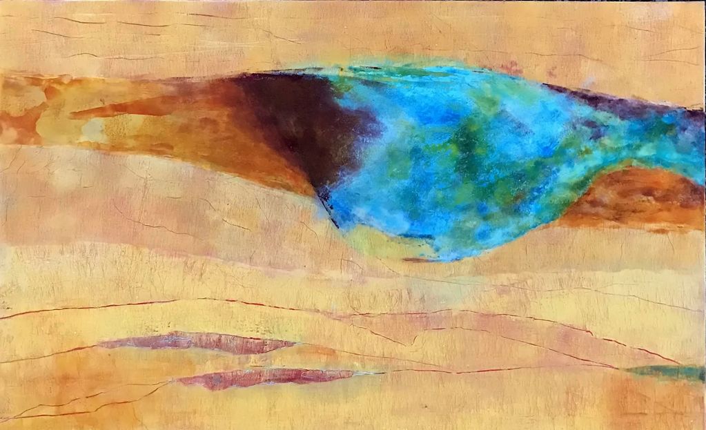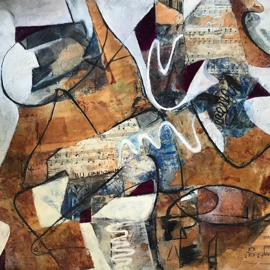 This work has a collage background on Arches Oil paper. Many layers of cold wax and dry pigments are layered, some scraped back to reveal the original collage work. My work is a reflection of the ebb and flow of my life. Embrace the uncertainty of not knowing what the meaning is, think about this work as a visual metaphor for what one might call reality.
